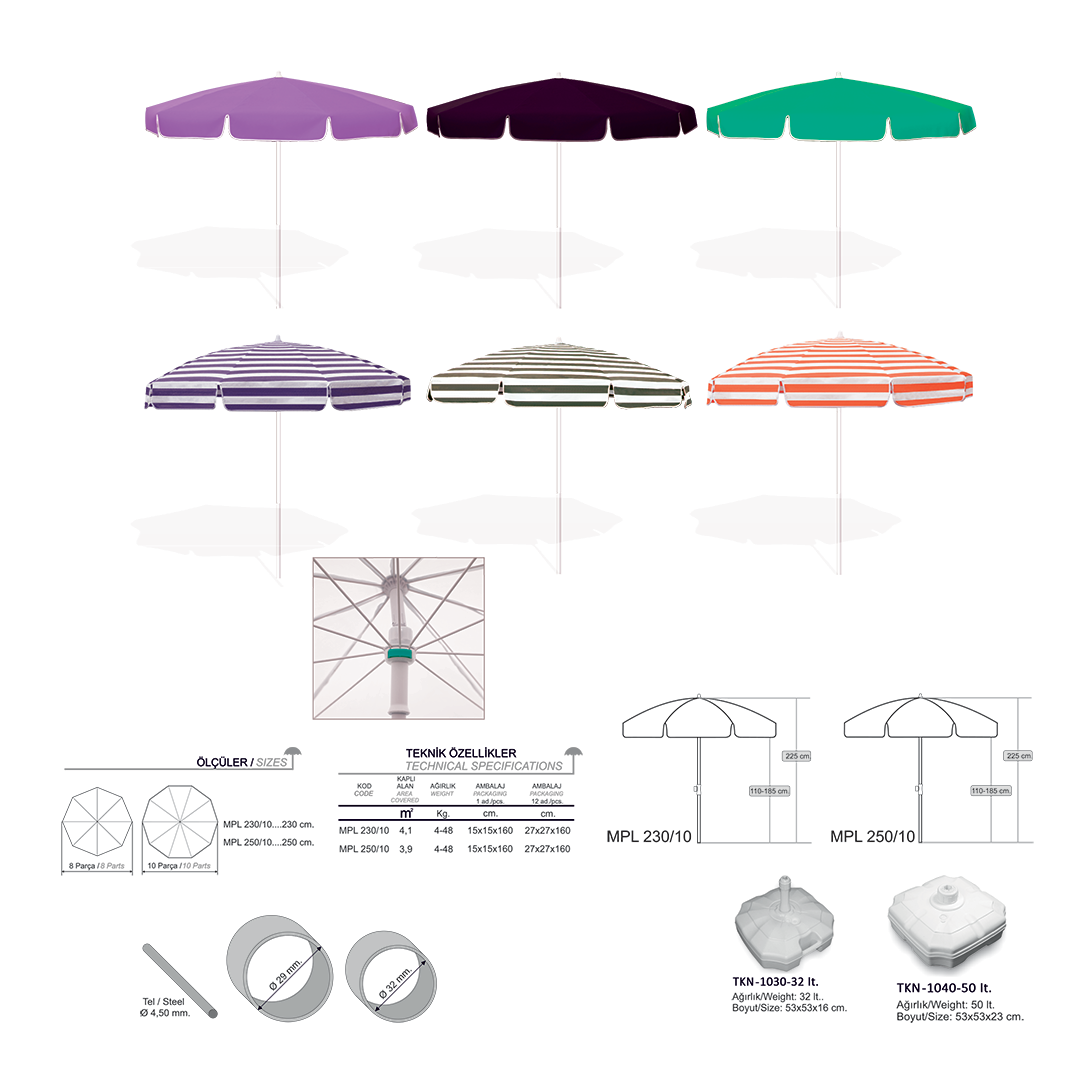 Bu şemsiyeler, bahçede, balkonda, plajda ve havuz kenarında kullanıma uygun olarak tasarlanmıştır.