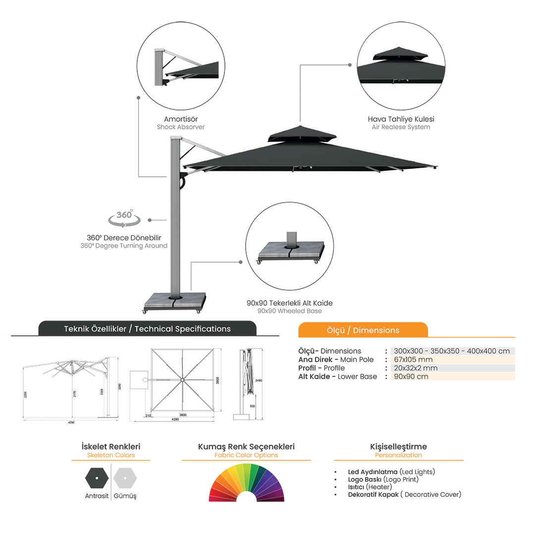 Özel taşıyıcı kaidesi ile 360 derece dönebilir. Zengin ölçü seçenekleriyle otel, kafe ve bahçelerde sıkça tercih edilir.