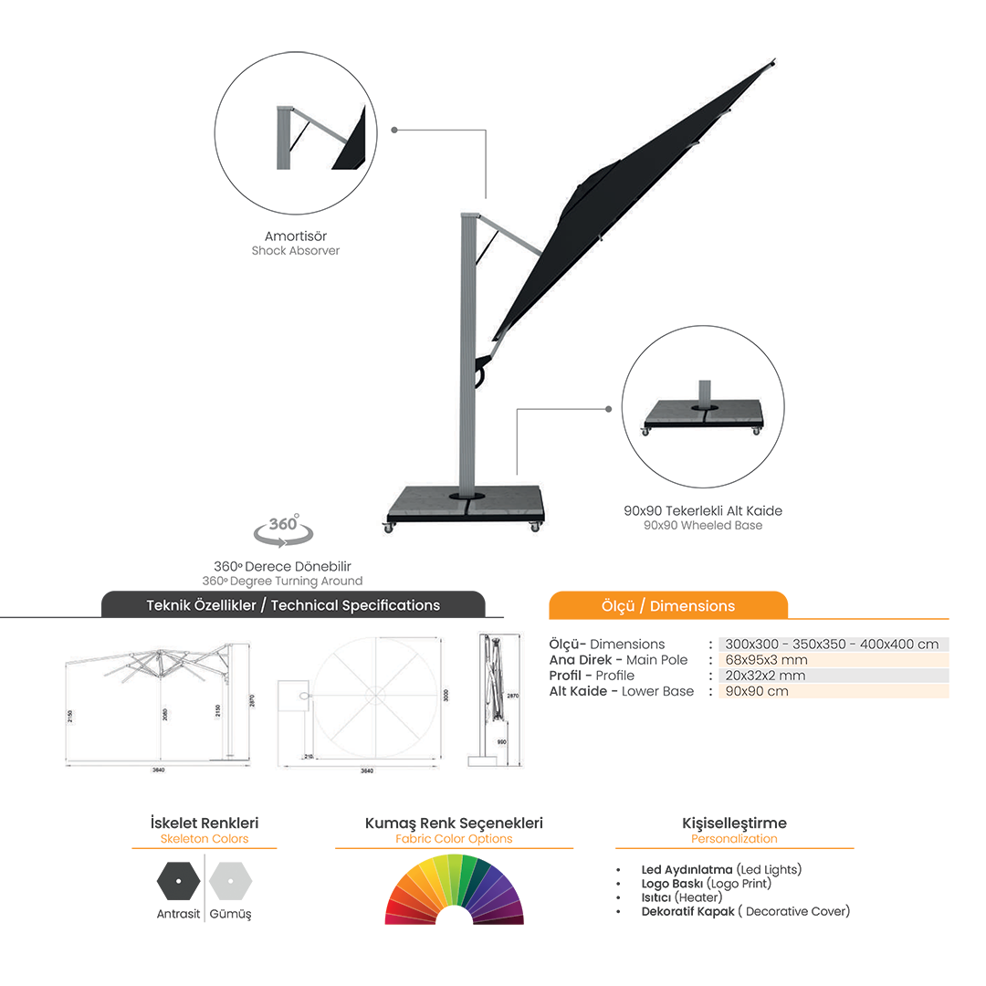 Özel taşıyıcı kaidesi ile 360 derece dönebilir. Zengin ölçü seçenekleriyle otel, kafe ve bahçelerde sıkça tercih edilir.