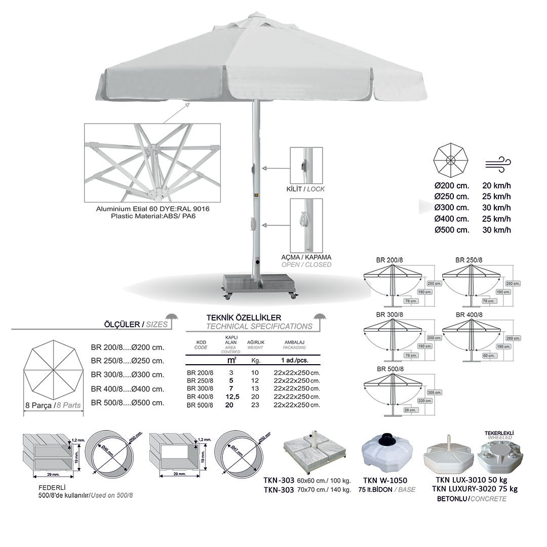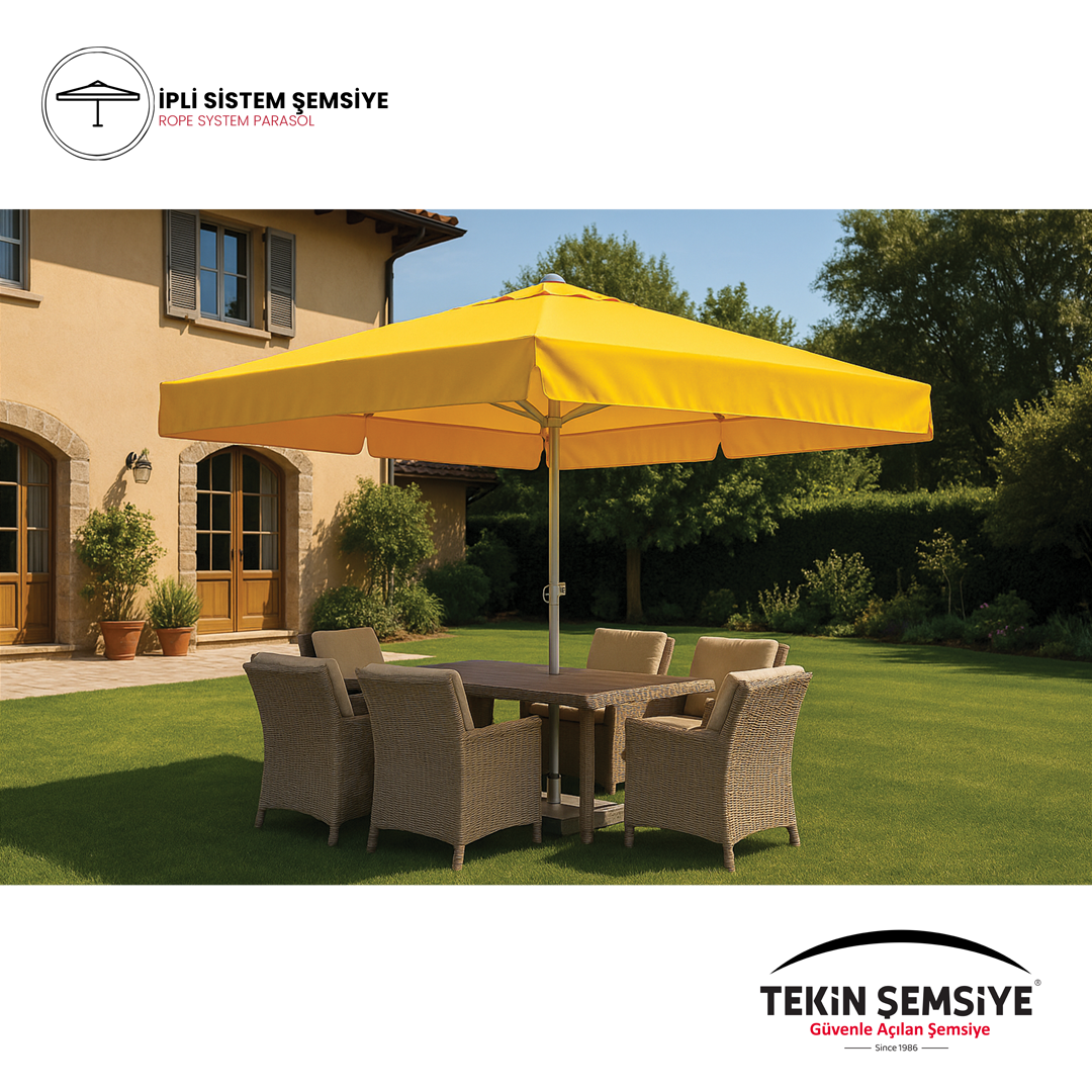 Kafe ve restoranların dış mekanlarında sıkça tercih edilen, sekiz kollu alüminyum profilli bu şemsiye, şıklığı ve dayanıklılığı bir araya getiriyor.
